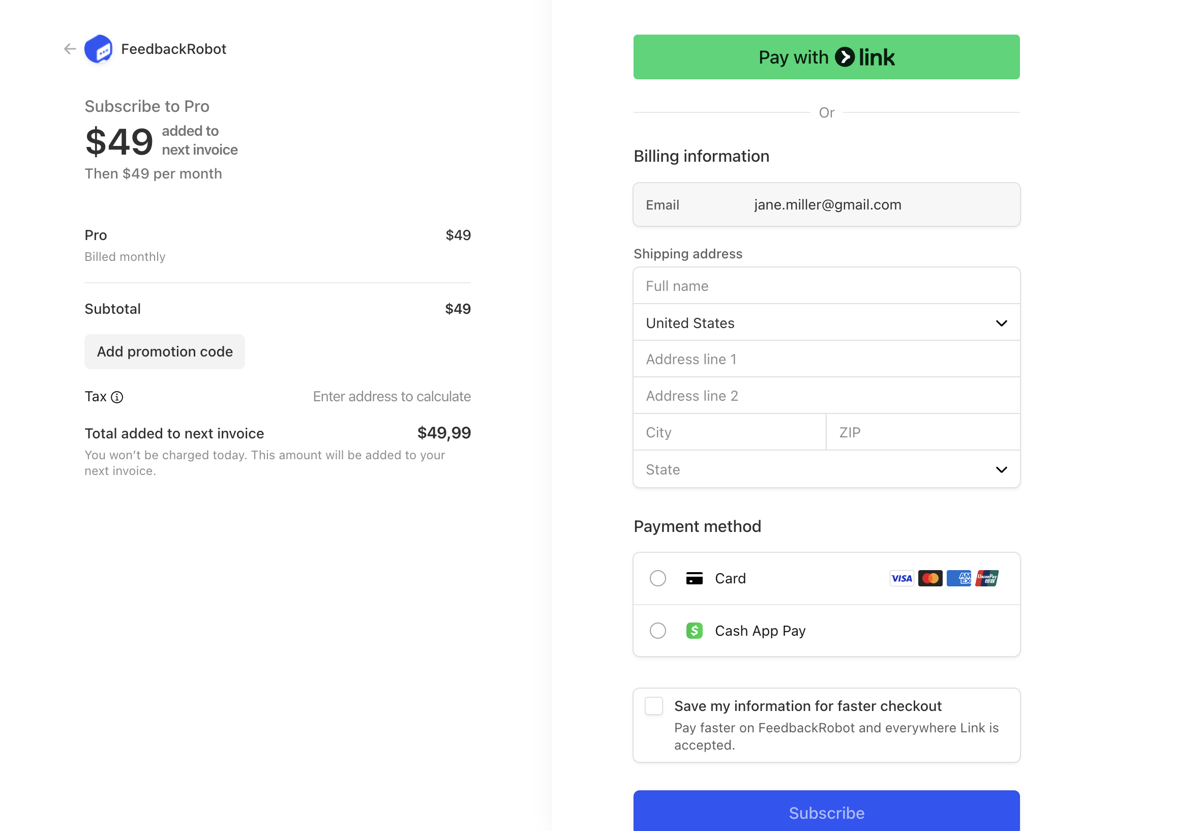 Upgrading your FeedbackRobot plan is designed to be straightforward: review your charges, apply any promotion codes, enter billing details, select a payment method, and confirm. If you encounter any issues, reach out to our Support team via the Help Center. Happy upgrading!